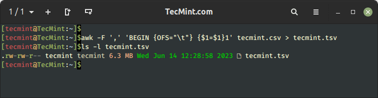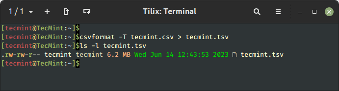 $ csvformat -T tecmint.csv > tecmint.tsv $ ls -l tecmint.tsv