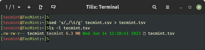 $ sed 's/,/\t/g' tecmint.csv > tecmint.tsv $ ls -l tecmint.tsv
