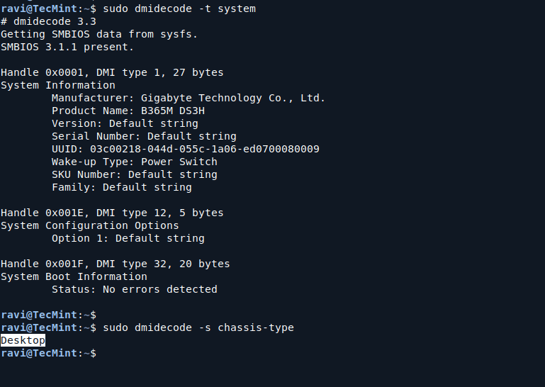或者,您可以使用chassis-typedmidecode 选项显示计算机硬件信息。