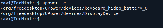 这upower命令可以提供有关连接到系统的电源设备的信息。如果系统是笔记本电脑,则应列出电池。