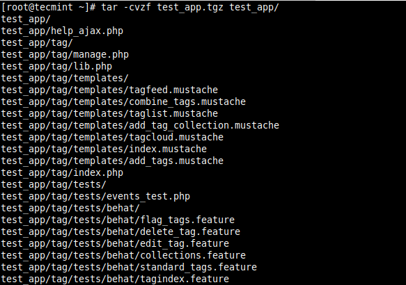在上面的命令中,焦油使用的标志是-c这创造了一个新的.tar存档文件,-v启用详细模式以显示.tar文件创建进度,以及-f它指定归档文件的文件名类型(test_app.tar在这种情况下)。