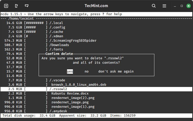 现在,您可以通过点击轻松查找并删除不必要的文件或文件夹以释放磁盘空间-d删除选定的文件或目录,删除前会提示您确认。按 ”是的“ 或者 ”不”。