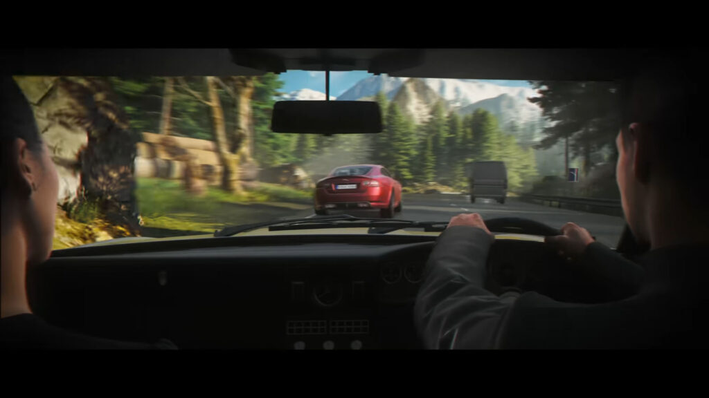 邦德在隧道中逆行、冲破栅栏、越野驾驶以及在山路上追赶一辆 X150 代捷豹 XKR Coupe 的画面被短暂地展现出来,这证实了游戏中将会出现授权车辆。
