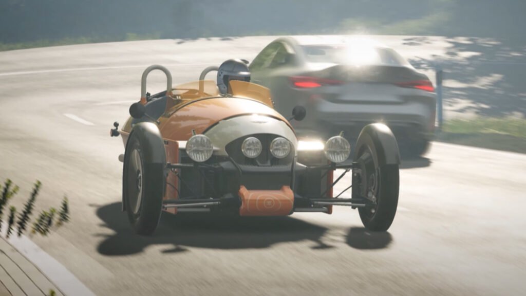 预告片似乎还揭示了开放世界风格的元素,展示了一辆摩根 Super 3 三轮车沿着公共道路行驶,一辆灰色的宝马 M4 CSL 从对面车道驶过。