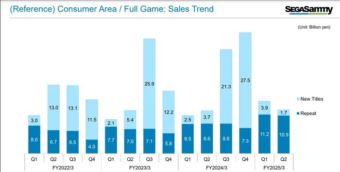 世嘉的过往产品表现较好,尽管也有所下降。较旧的标题如独角兽霸主表现“强劲”,该细分市场在同一季度内从 112 亿日元小幅下降至 109 亿日元。