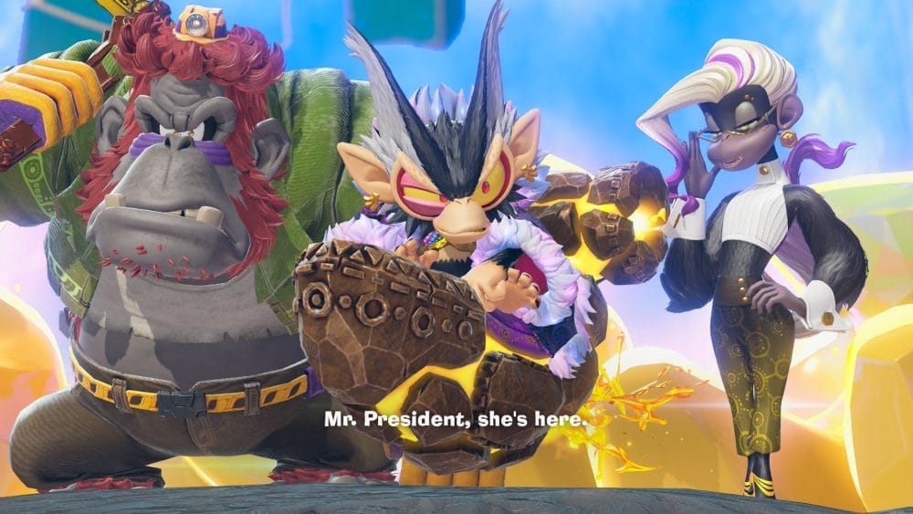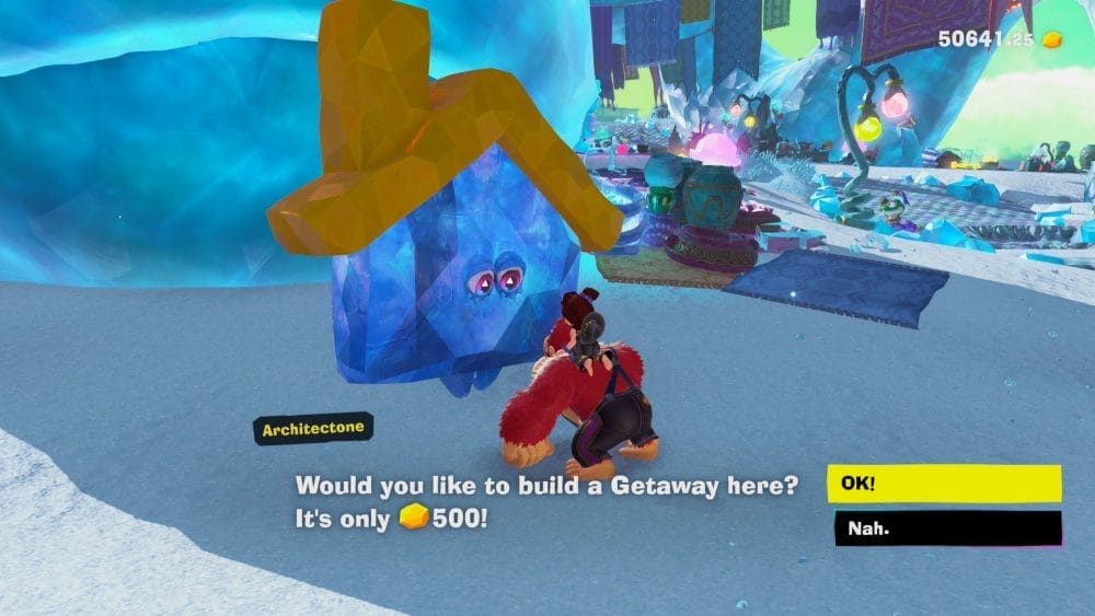 游戏中到处都是 Fractones,一种类似水晶的生物,可以形成各种形状和品种。他们居住在游戏的许多角色中,你会花很多时间与他们互动。 Fractones 经营着商店,您可以在那里购买服装、用收藏品交换香蕉以及购买消耗品。他们还为您提供下一步该去哪里的线索,并建立您的度假胜地(您可以在那里休息并恢复心情)。它们也是完全可破坏的(在大多数情况下),而且它们似乎可以接受你不小心将它们砸成碎片。
