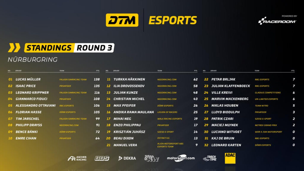 DTM Esports 2025 第 6 场比赛后的冠军积分榜
