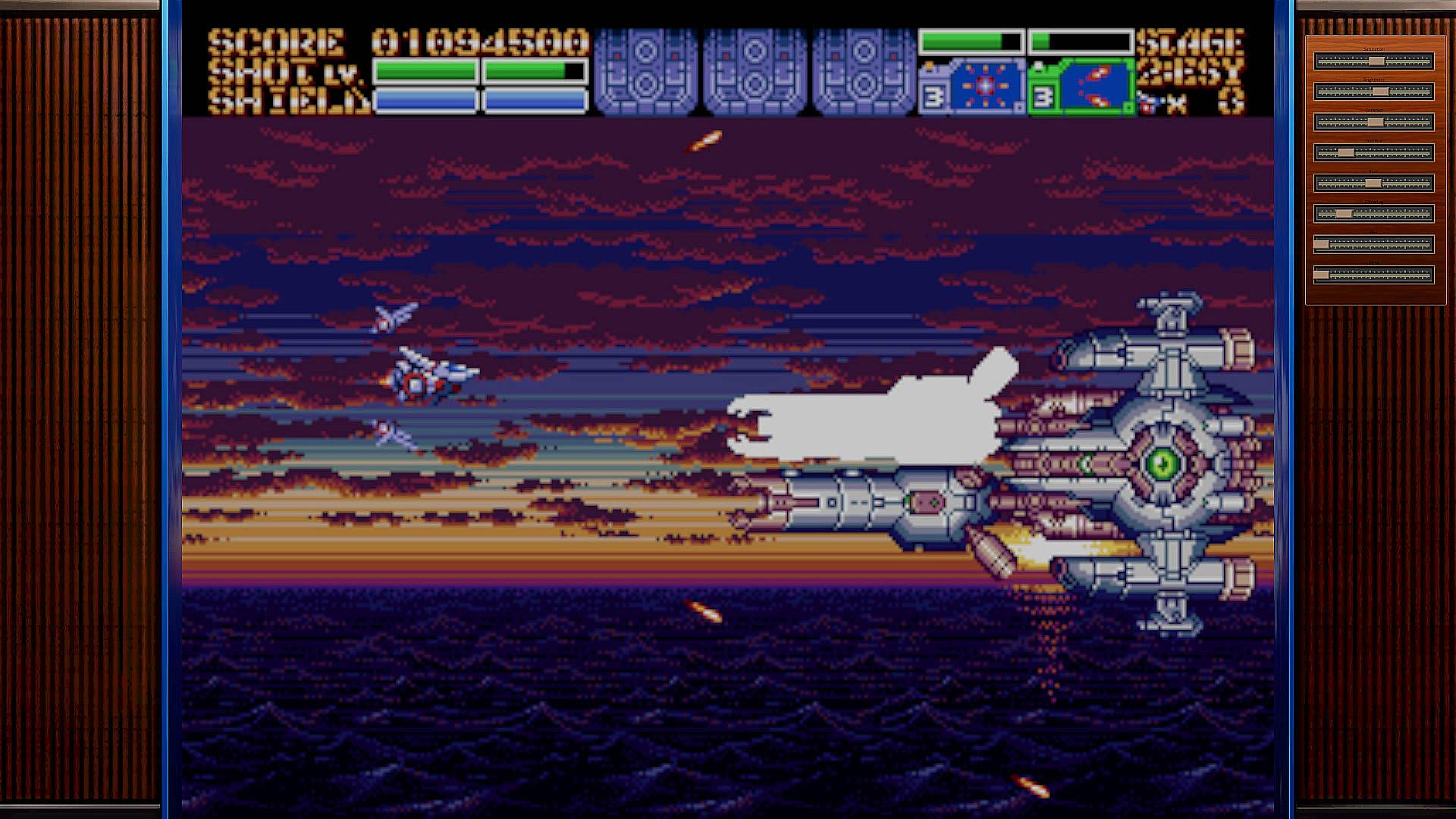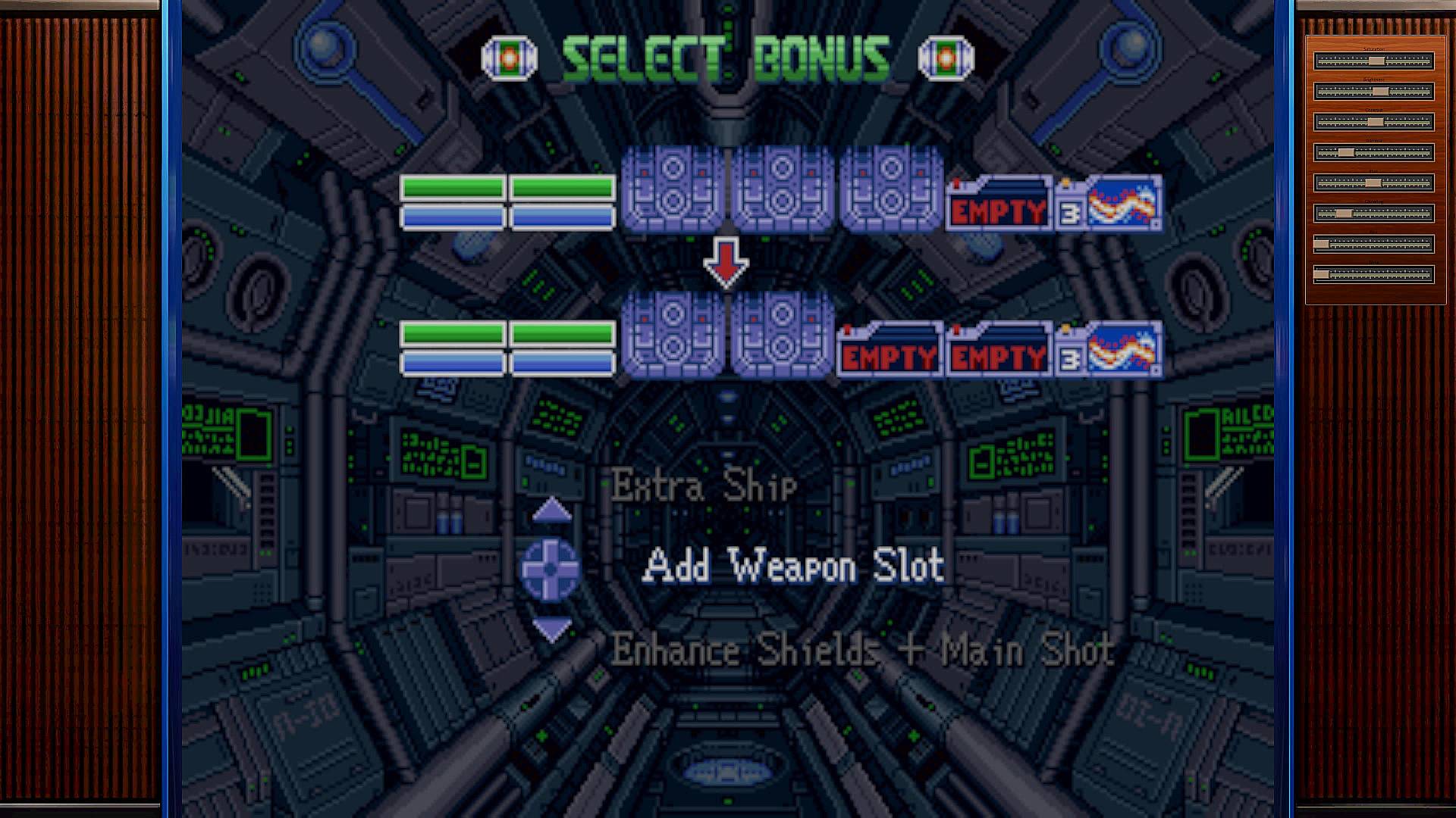 对我来说最突出的一个特点是游戏的升级系统。在整个阶段中,都会有一些称为“适应舱”的物品可供抓取。通过将其放入武器槽中并保留到阶段结束,您就有资格进行船舶升级。这些升级范围从提高子武器的最高等级到添加更多的船只(生命)等等。其中一些漂浮在舞台上,另一些则在敌人被击败时显露出来。这是一个有趣的补充,可以让你改进你的飞船并变得更加强大。或者甚至提高你的生存能力,尤其是面对老板时。