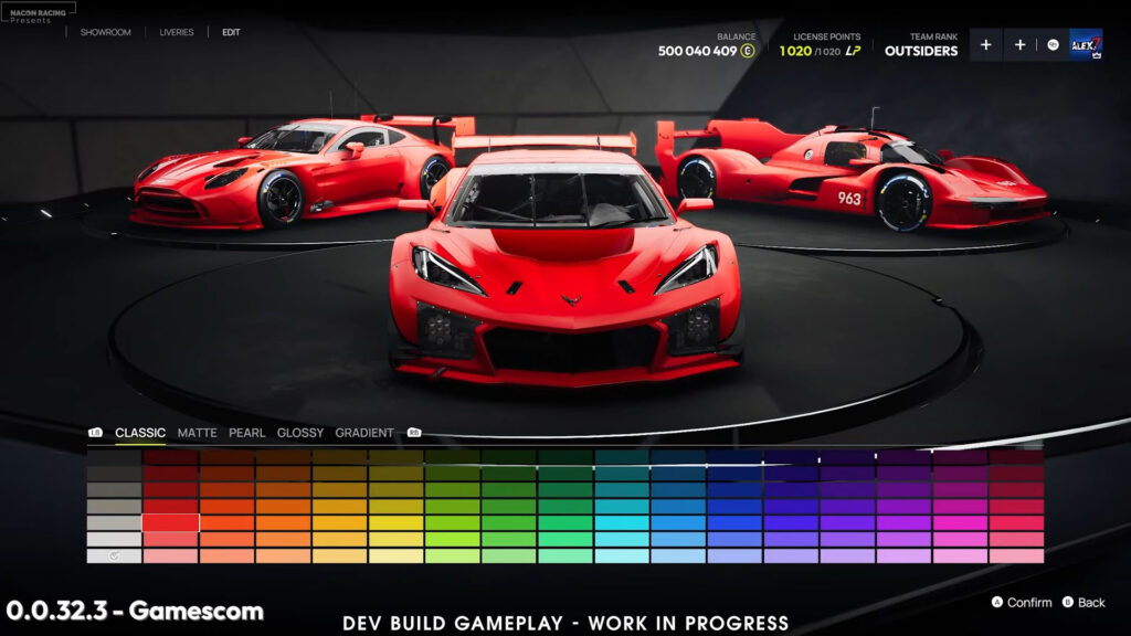 在视频中,KT 首次展示了涂装编辑器。这允许您选择预设设计或通过应用不同的颜色层来创建自定义制服。为了使这一过程变得快速、简单,制服可以自动应用到所有三辆车上,从而创建您的团队的身份。