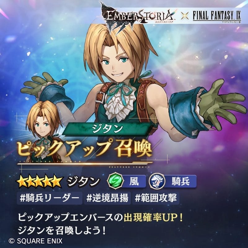 FFIX 与 Emberstoria 的合作从 7 月 1 日持续到 7 月 30 日,齐达内·部落 (Zidane Tribale) 和维维·奥尼蒂尔 (Vivi Ornitier) 都以新的“Emverse”身份加入游戏,同时还添加了 Tonberry 作为新的“野外魔兽”。