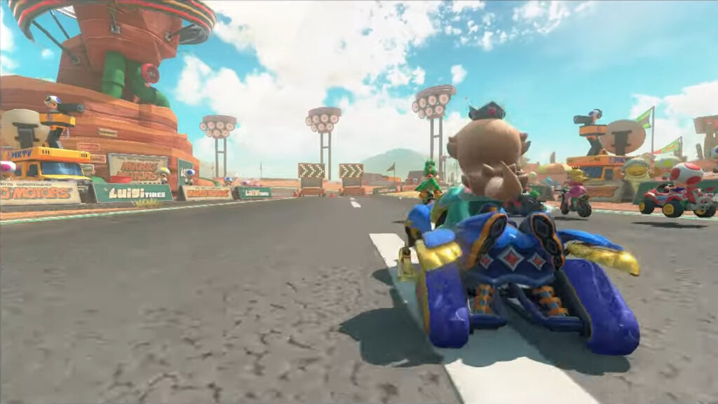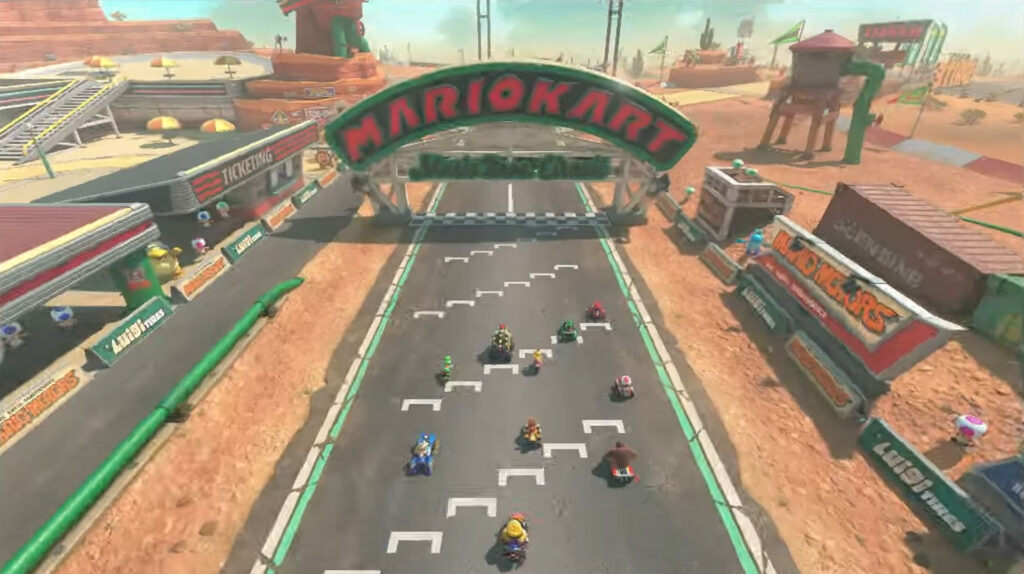 最后的广角镜头表明马里奥。兄弟赛道的规模将比之前任何马里奥赛车赛道都要大,巨大的峡谷岩石俯瞰着地平线。越野路线也分散在主干道周围,暗示着分支路线、捷径或可能是一个开放的世界。或者,路线可能会在每圈后发生变化,在停机坪和沙漠之间切换。