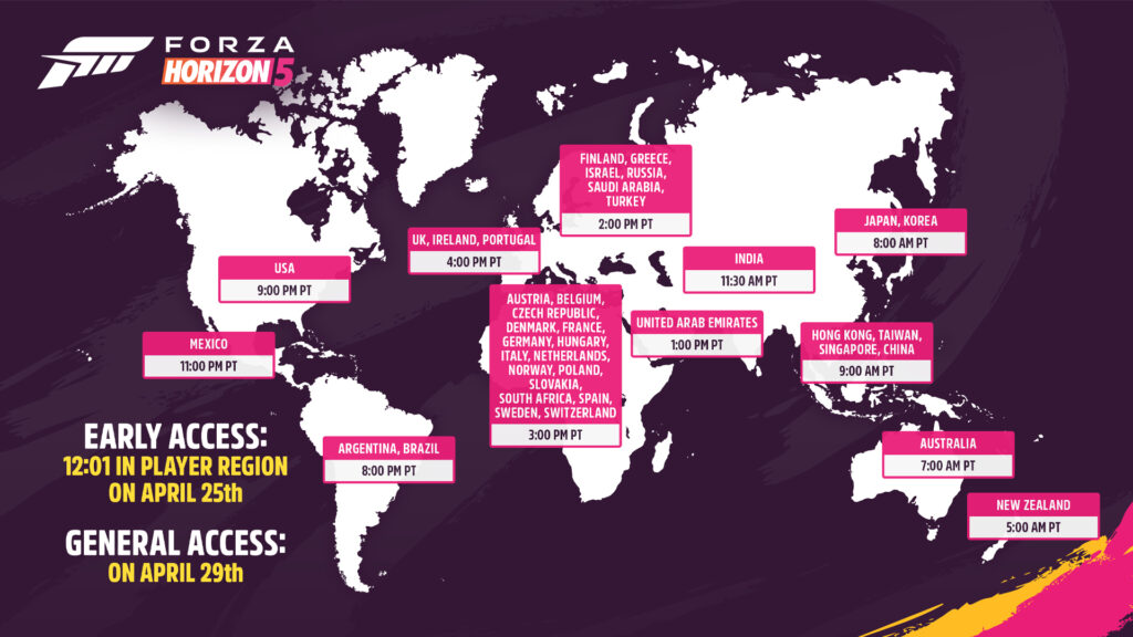 相当令人困惑的是官方Forza Horizon社交媒体帐户分享了一个图像,说明每个主要区域转换为太平洋时间的时间12:01的时间。