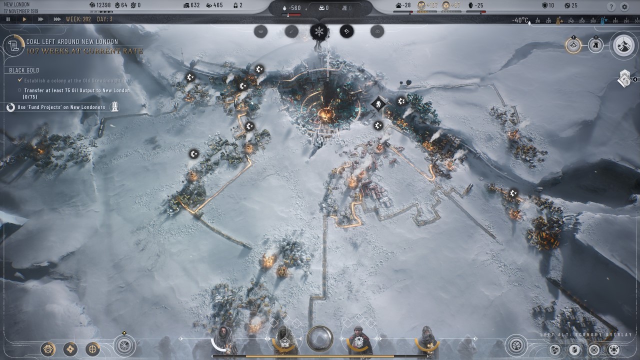 最初,你试图在第一个《霜朋克》中找到足够的煤炭来度过即将到来的冬天。新的故事讲述了煤炭储量即将耗尽以及这座城市对接下来会发生什么感到恐惧的故事。这就是本教程中的新燃料来源——石油的用武之地。当然,你不会在新伦敦周围找到任何石油。你需要侦察并建造卫星定居点,并将石油运回新伦敦。