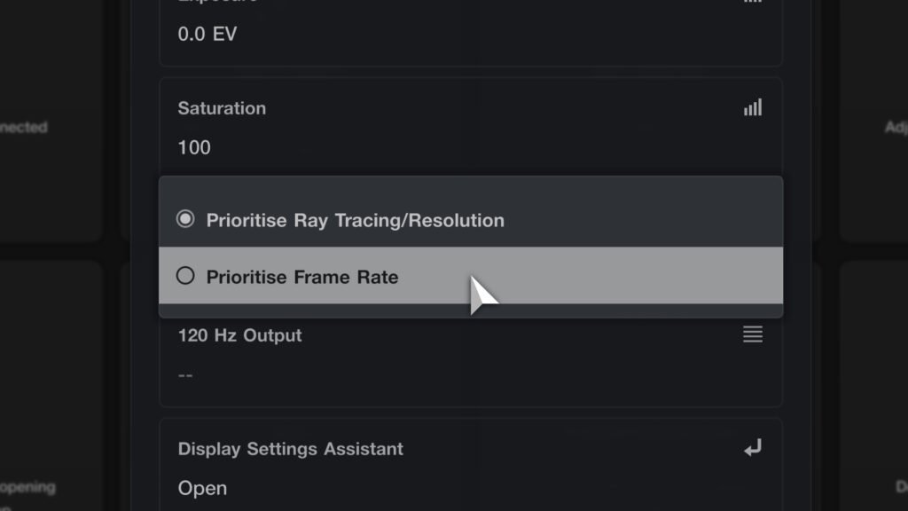 目前,“标准”PS5 在菜单和重播(而非比赛)期间支持光线追踪,并将动作上限限制为 30 fps。游戏中有一个选项可以“优先考虑光线追踪/分辨率”或“优先考虑帧速率”。