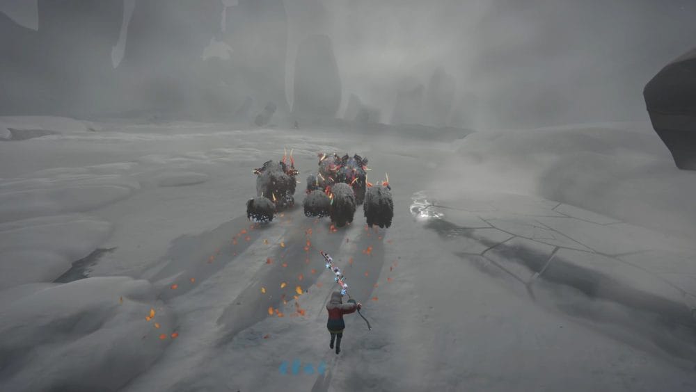 虽然你的巨蜥非常无助,但它们并非毫无用处。在你的旅程中,你会遇到一些简单的环境谜题,其中一些需要你的牧群的输入。它们可以帮助玩家角色推动重物或将牧羊人推上高高的壁架。玩家角色可以独立于畜群移动,允许您根据需要进行机动,以及单独探索世界并与世界互动。幸运的是,如果你距离牧群太远,不会出现随机威胁,但没有它们你就无法继续前进。