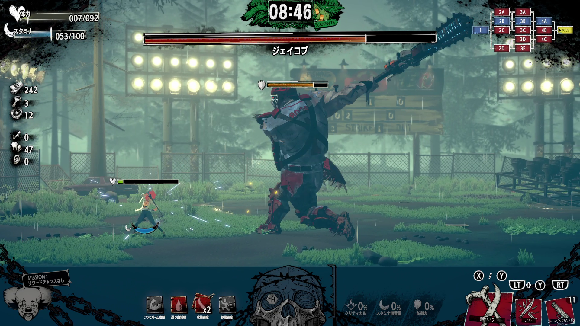 每个级别都有一个固定的结构,其中有分支房间,所有这些房间最终都会通向老板,但是每次运行之间的变化是每个房间的状态以及进入它们的奖励。有些房间会用钥匙奖励玩家,这些钥匙可以解锁箱子以获得奖励,而另一些房间则会补充生命值或提升移动或战斗速度等特性。还有其他变量,例如贾斯汀的物理尺寸会发生变化的随机时刻,对于影响战斗难度的跑步来说变得更大或更小,或者一天中改变敌人行为的时间以及在跑步中出现的敌人。这种可变性是防止巴塞罗那酒店的固定关卡设计变得过于陈旧的主要因素,但游戏的 Slasher Phantom 机制又增加了另一层。