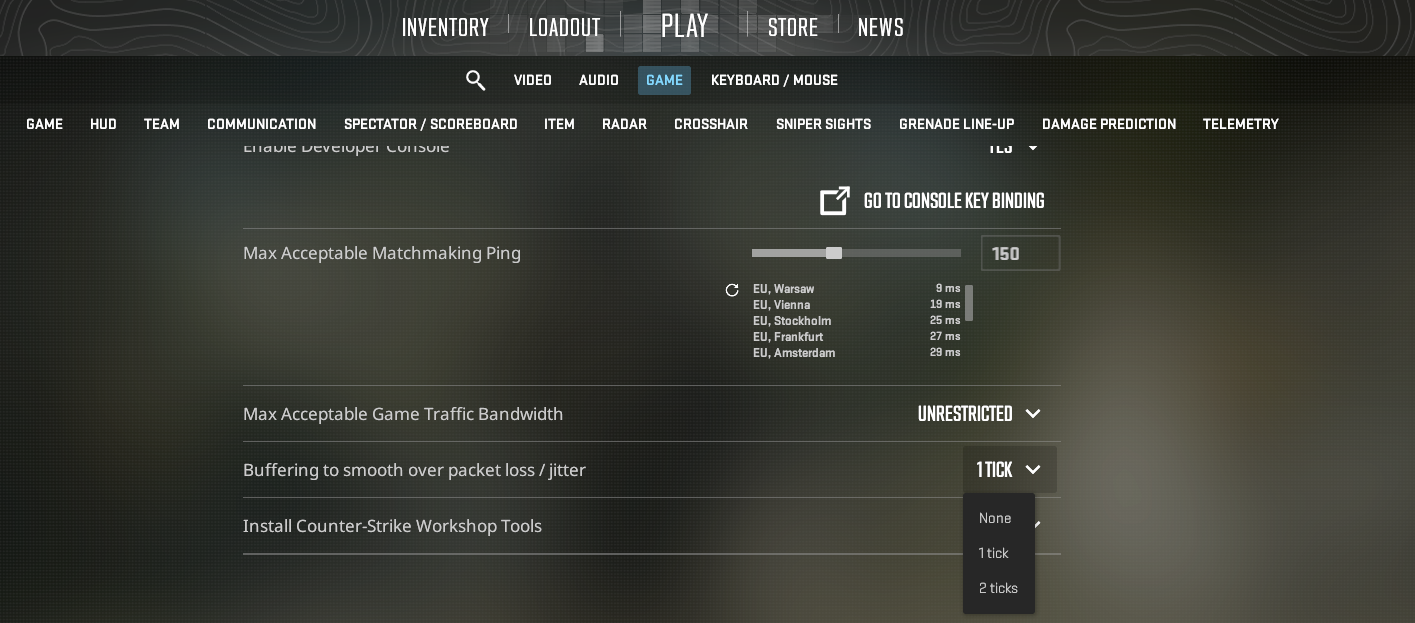 在“设置”→“游戏”中,查找选项“缓冲数据包丢失。”这控制了客户端缓冲区的额外滴答数以解决网络问题(它基本上是旧 cl_interp_ratio 的新形式)。对于大多数连接稳定的玩家,将此设置为“没有任何”(无额外缓冲)以实现最低的输入延迟。但是,如果您遇到丢包或经常看到连接警告图标,请尝试将其设置为1或者2缓冲滴答声。如果您的互联网不稳定,小缓冲区可以平滑敌人的移动,但要尽可能保持低缓冲区,因为更多的缓冲区会增加一些输入延迟。