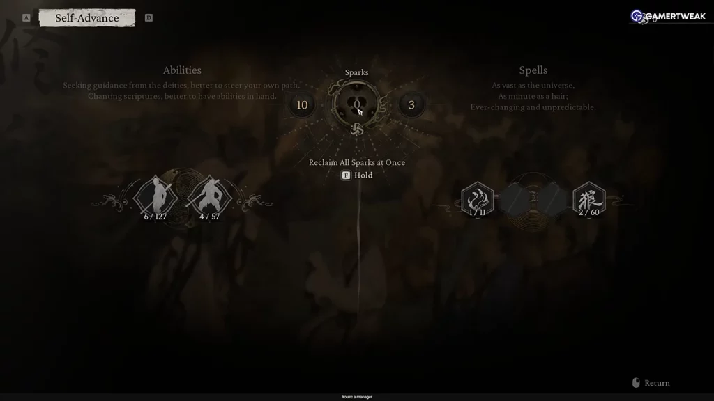 拥有它们后,您就可以打开自助高级菜单并分配火花来解锁或升级能力和咒语。