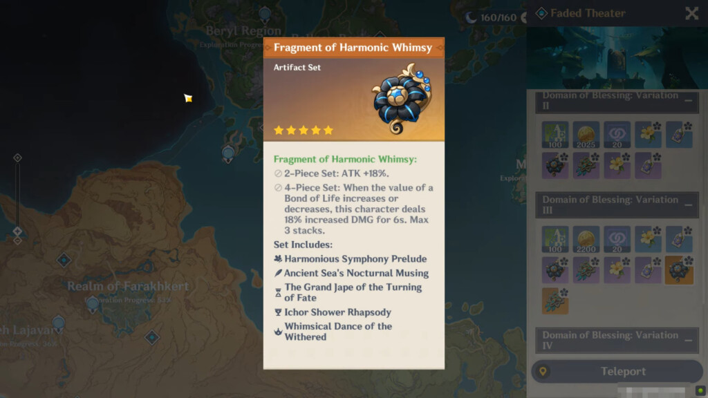 仅保证您获得领域 II 级或更高级别的 4 星级神器,所以在那之前你不应该费心去耕种褪色剧院。还需要注意的是,所有可用套装均等分配,这意味着在领域级别 II 及更高级别,保证的 4 星掉落有 50% 的几率来自未完成的遐想或谐波奇想碎片套装。简而言之,无法保证您获得的任何 4 星或 5 星物品都来自 Harmonic Whimsy 碎片套装。
