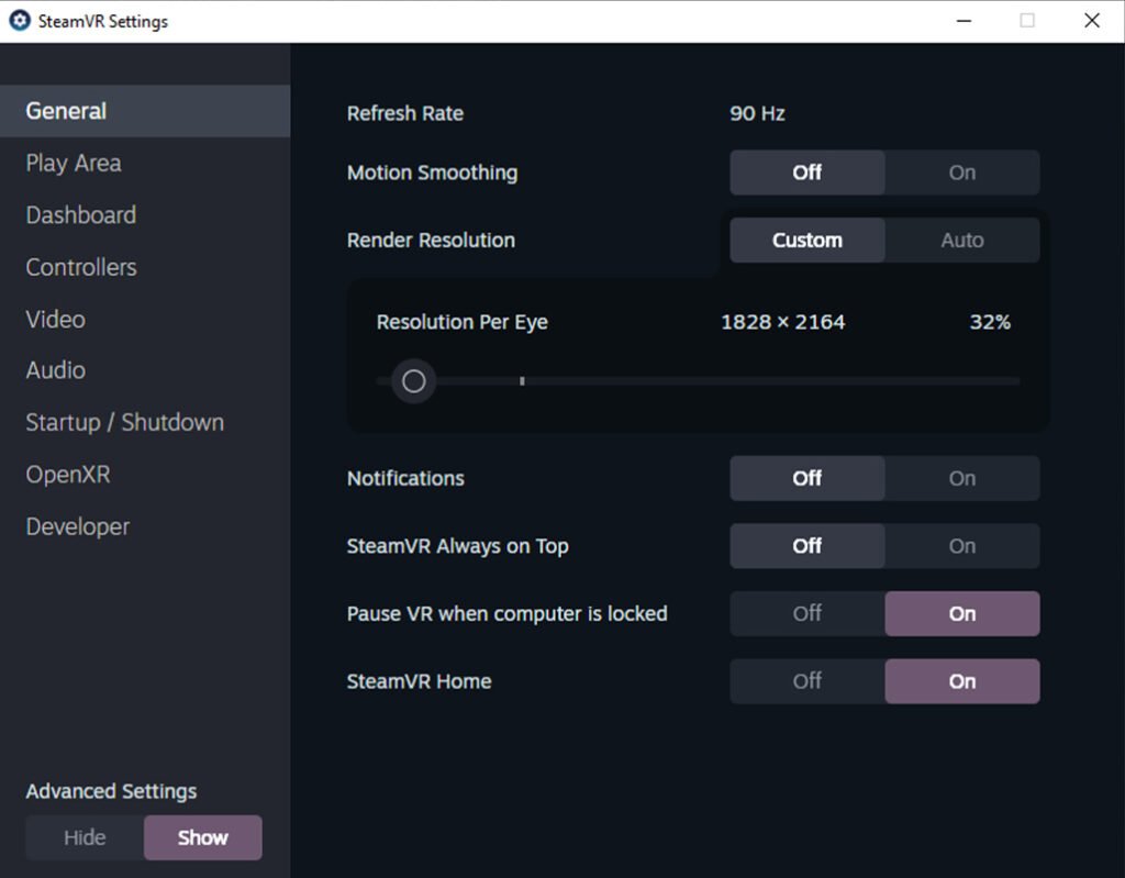 在 Pimax 中使用中等渲染质量和 90 Hz 刷新率,我还关闭了固定注视点渲染 (FFV),以获得尽可能最佳质量的 VR 图像。