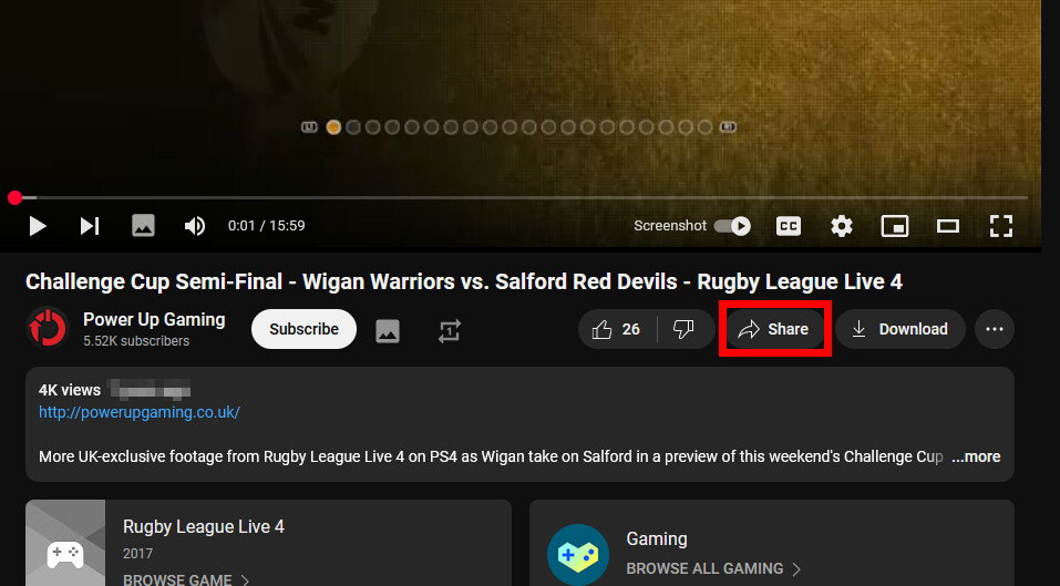 一旦您的剪辑出现在 YouTube 上,您所要做的就是在浏览器中打开它们,然后单击分享按钮。