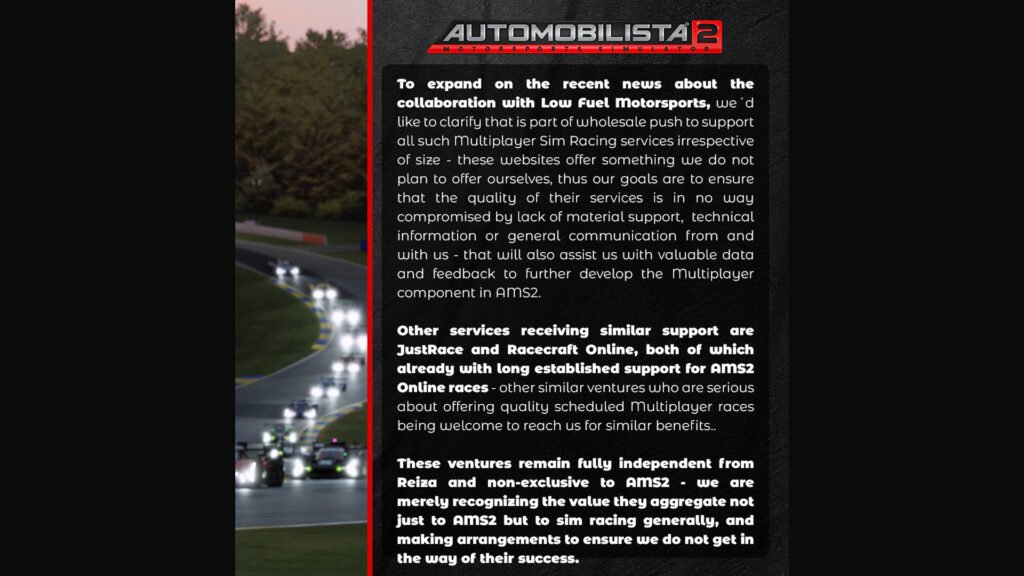 上周末,第三方排名多人游戏提供商 Low Fuel Motorsport 证实,它正在与 Reiza 合作开发 Automobilista 2 兼容性。该工作室随后澄清称,这种合作关系并不相互排斥。