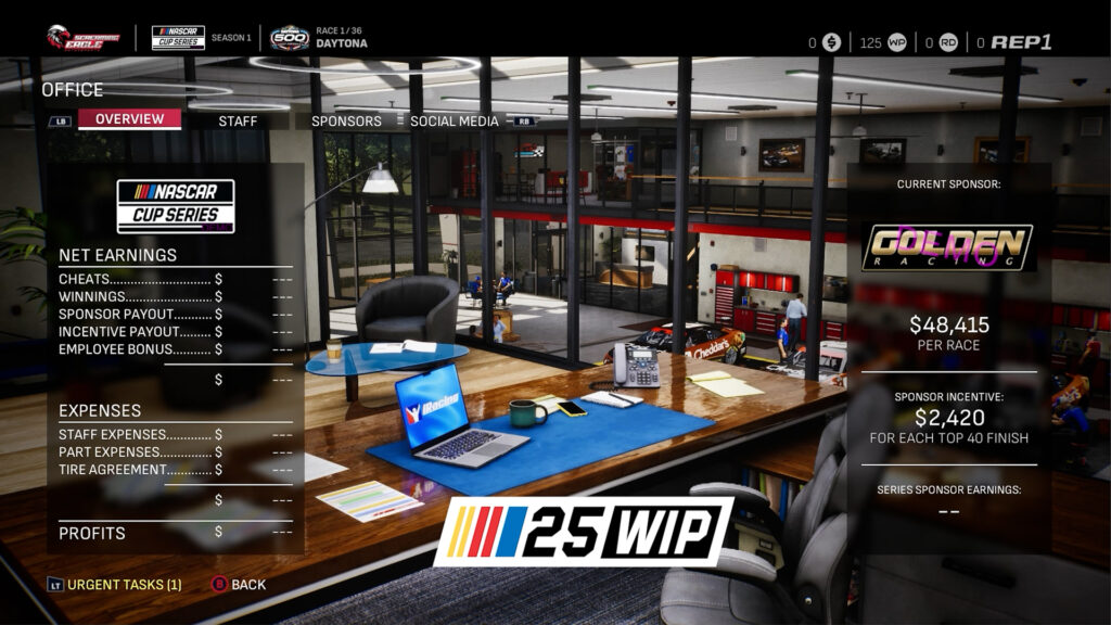 菜单屏幕还展示了某种形式的赞助管理系统,以及员工控制和损益屏幕。上下文相关的社交媒体帖子将会突然出现,听起来类似于 F1 游戏的刹车点模式或当前 MotoGP 游戏的职业生涯。