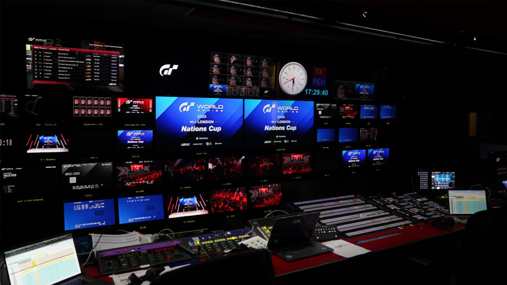 在后面,来自 Getty Images 的 Clive Rose 使用 PlayStation 5 Pro 拍摄《Gran Turismo 7》游戏中刚刚完成的比赛。他左边是四名干事,他们在直播期间现场工作。前面是一片热闹的景象,屏幕比 Currys 的一家分店还多。