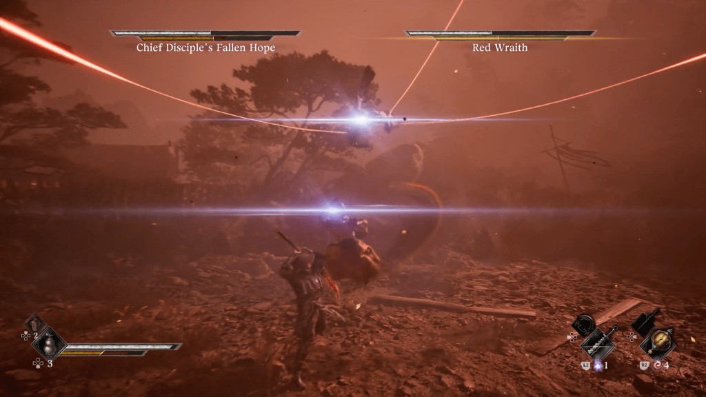 敌人可以被躲避或招架,我建议优先考虑后者,因为每个敌人都有一个姿势栏,你可以磨损它以击晕他们以造成巨大伤害。有些攻击必须躲避——敌人会因此发出红光,如果你把握好时机,你将施展幽灵步;传送计数器可让您溜到敌人身后并从意想不到的角度进行攻击。它旨在奖励攻击性和时机,而不是谨慎的盘旋。完美格挡发出蓝色光芒的动作也有同样的效果,形成巨大的姿势,让你感觉自己像个坏蛋。