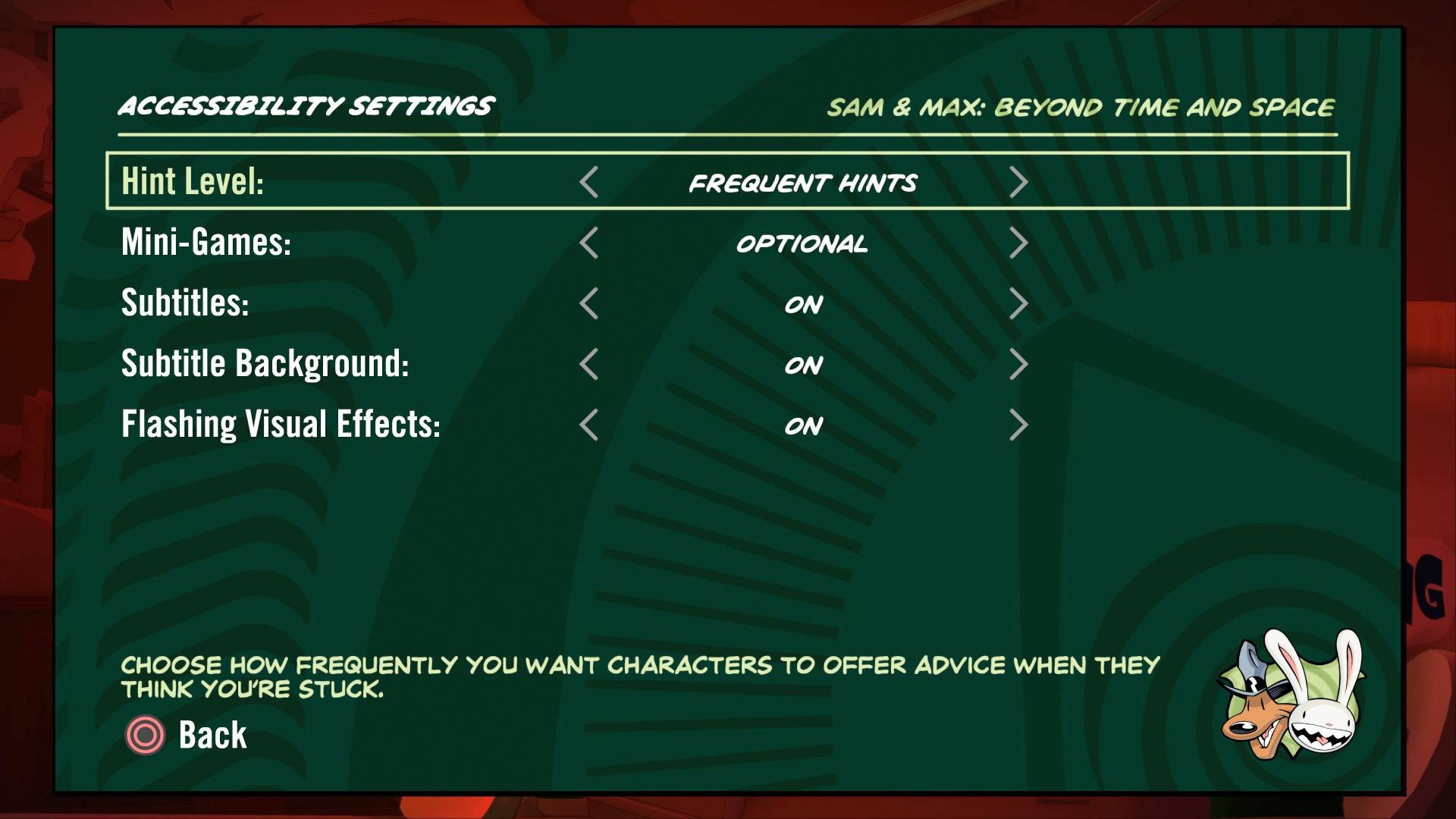 山姆和麦克斯:完整三部曲在很多地方都很强大,但它的可访问性绝对有待提高。游戏提供了多种选项,例如字幕、关闭闪烁效果以及为卡住的玩家提供更多提示。但是,改进提示系统是我想到的一个想法。我发现自己有时会卡在某些区域并向角色寻求提示,但只会得到模糊的文本,这并不是进步的可靠方法。添加去哪里以及与谁或什么交互的方向指示可以极大地改进游戏。玩家可以打开一个标记为“辅助模式”的选项,这可以帮助引导他们以这种方式进行更多操作。除此之外,游戏还提供不同的辅助选项,可以容纳许多玩家。