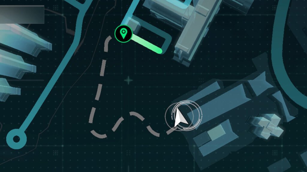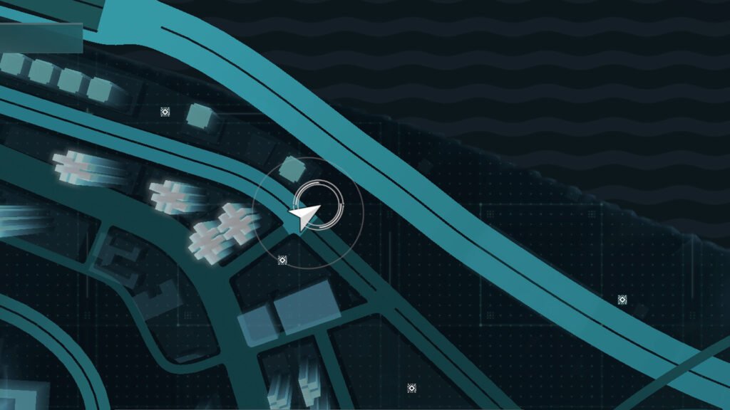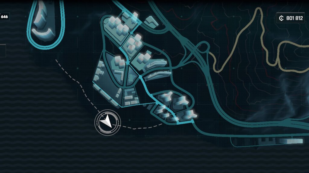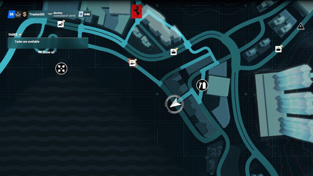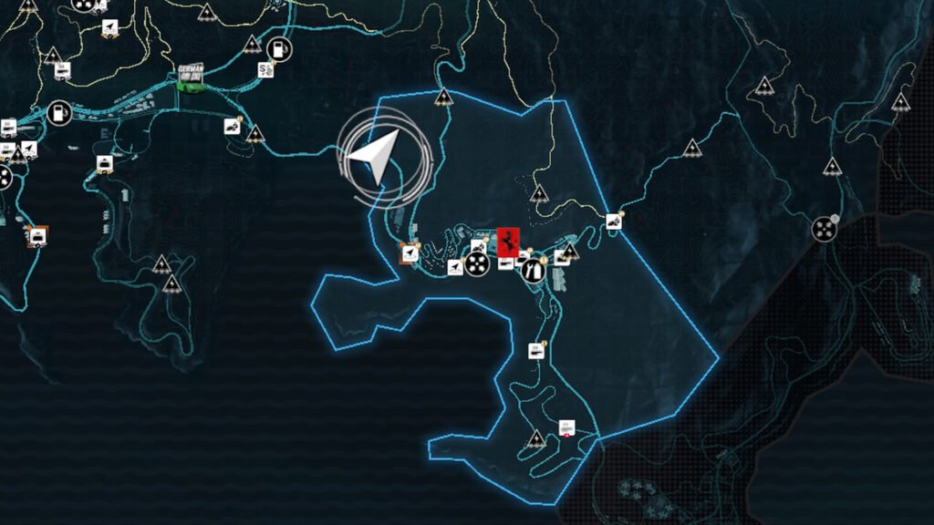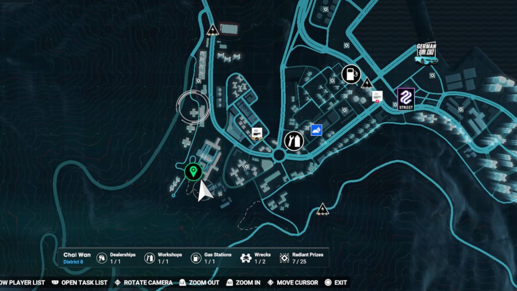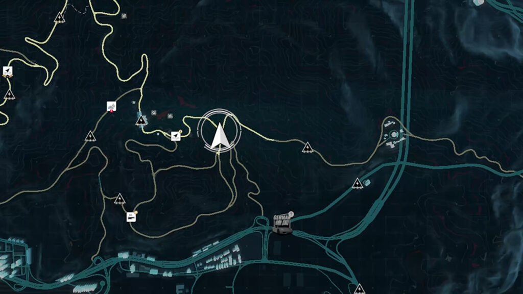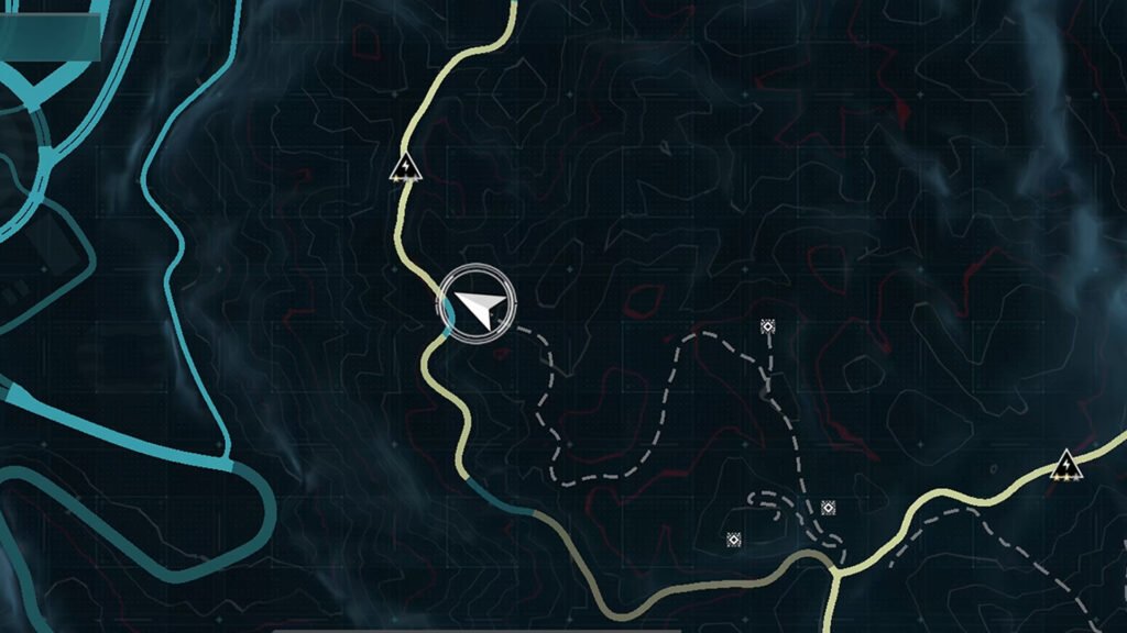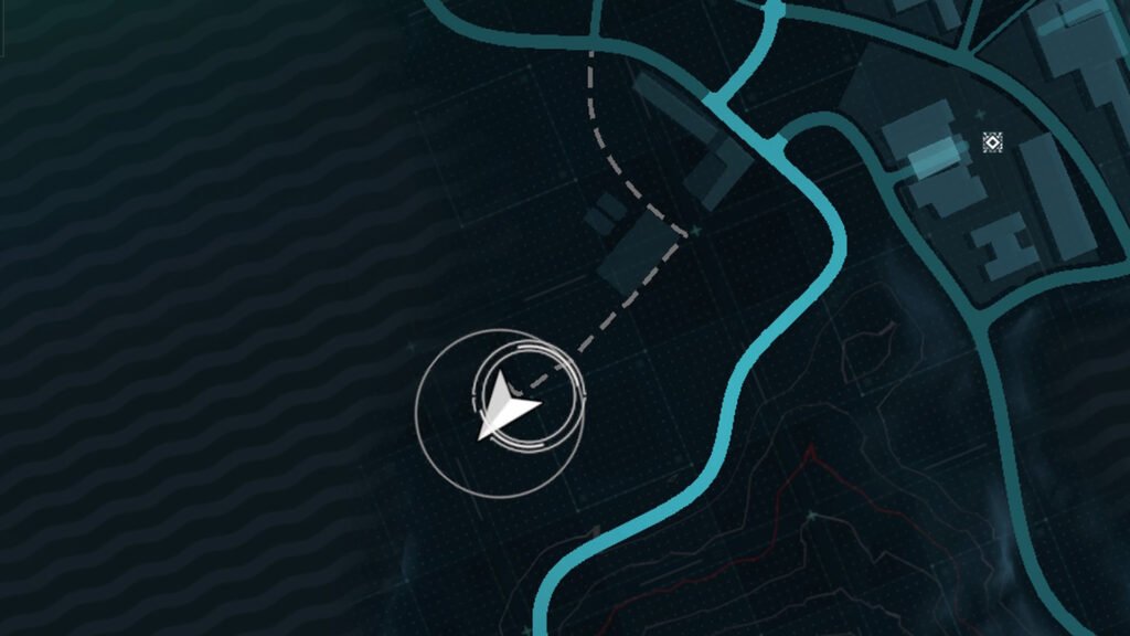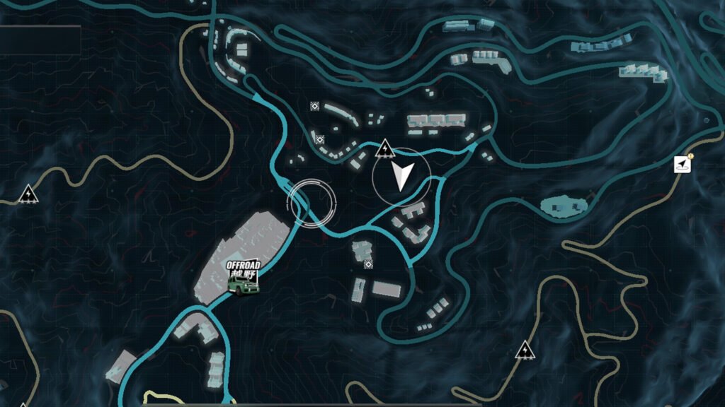 进入后会在地图上添加一条虚线。沿着这条路一直走下去,直到找到由四栋建筑物组成的街区。残骸位于其中一栋建筑物的类似车库的区域。