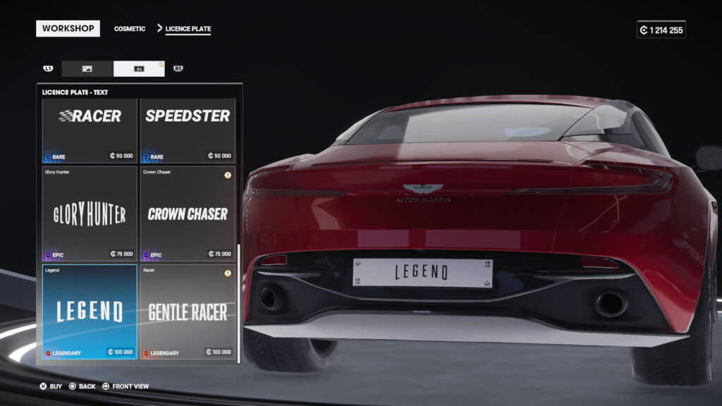 汽车定制也得到了扩展,包括新的轮圈设计和定制车牌,允许您添加彩色背景或更改文本。但是,您无法添加自己的文本,大概是为了阻止您添加顽皮的单词。有些价格昂贵得令人眼花缭乱:一张镶金的车牌将花费你高达 350,000 的积分。嗯,不用了,谢谢。