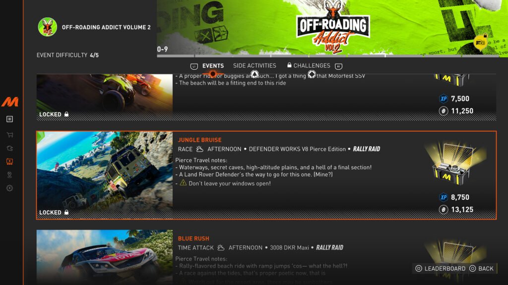 与第二卷的漂移播放列表类似,还有九个进一步的事件、六项壮举和六次拍照机会。完成主要活动即可获得经过特殊改装的吉普牧马人并解锁一系列可选挑战。