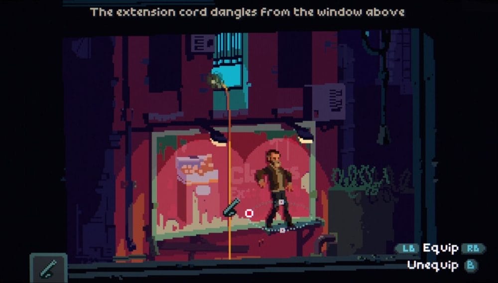正如我之前在这篇评论中所说,《漂流者》自豪地展现了它的灵感,甚至片头也给人一种 80 年代恐怖电影的感觉,在屋顶海洋上的黑暗地平线前,有锐利的红色字体。虽然这款游戏通过其详细的像素艺术确实让人回想起它的前作,但由于大部分场景发生在夜间,因此它在大多数环境中都具有较暗的调色板。