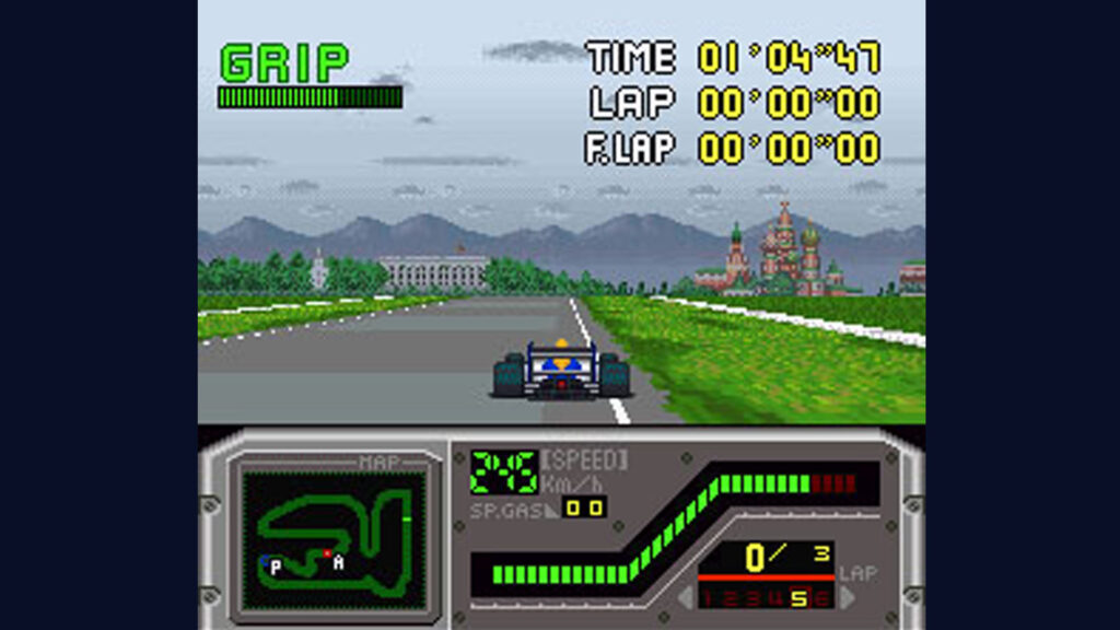 该游戏以 1992 年赛季为基础,采用了 Mode 7 图形以及日本车手铃木亚久里 (Aguri Suzuki) 的外观,铃木亚久里曾在 1988 年至 1995 年间参加过一级方程式赛车。定制化程度出人意料地深入,能够调整机翼、刹车和悬架,暗示了开发者对《Tokyo Xtreme Racer》的未来抱负。