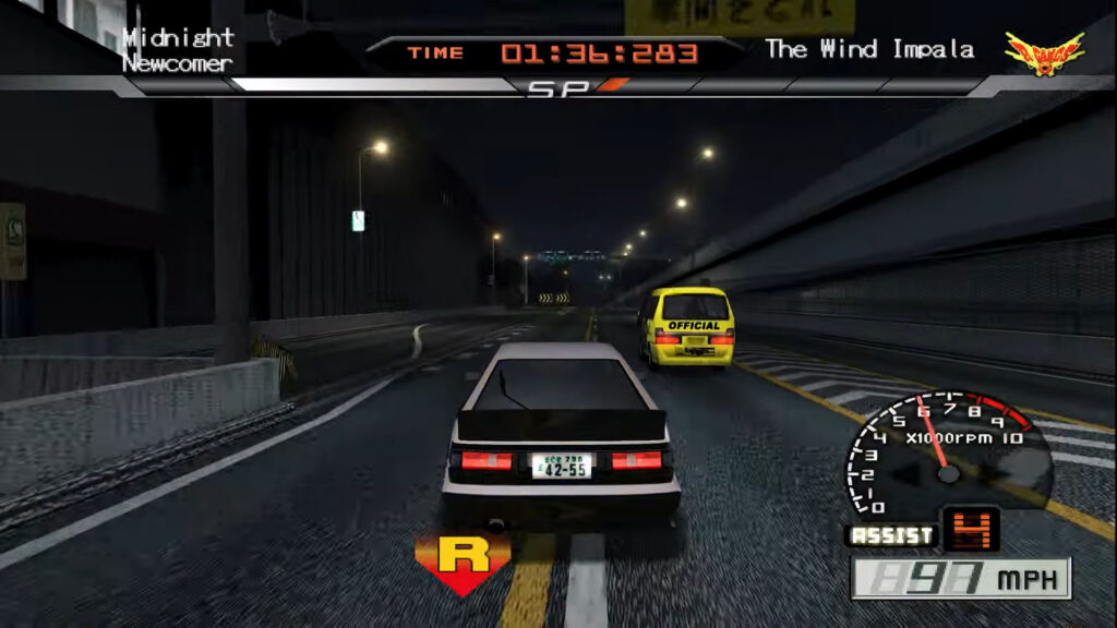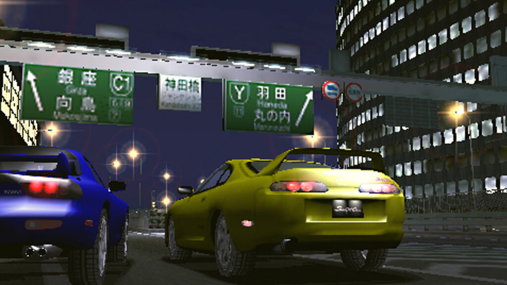 《东京高速公路之战》拥有 72 辆虚构汽车,玩家可以在基于东京高速公路的三个赛道上竞速并穿梭于车流中,专用的漂移按钮让新手更容易上手游戏。汽车定制比任何其他 PlayStation 赛车都更加全面——直到一年后 Gran Turismo 登陆日本。