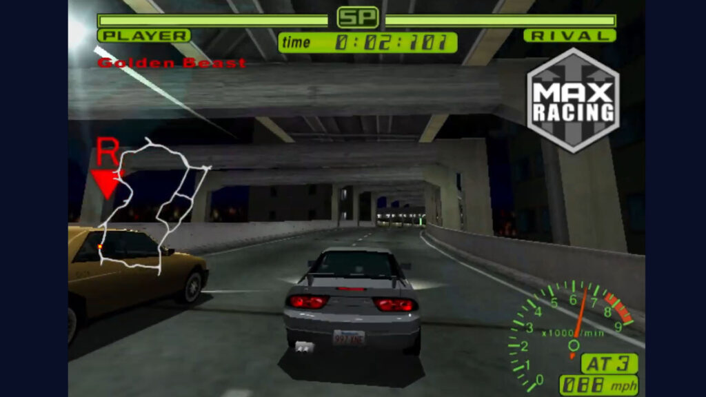 直到 1999 年,《Tokyo Xtreme Racer》这个名字才被引入西方,第一个参赛作品在日本简称为 Shutokō Battle,在欧洲简称为《Tokyo Highway Racer》。作为命运多舛的 Dreamcast 的首发游戏,它引入了定义该系列的标志性 SP 战斗系统。
