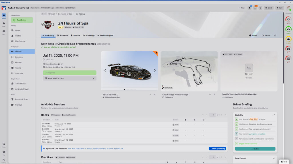 iRacing 24 小时斯帕特别赛事将出现在 iRacing UI 的“官方”部分下,选择合适的比赛时间后,可以通过单击“注册”按钮加入。