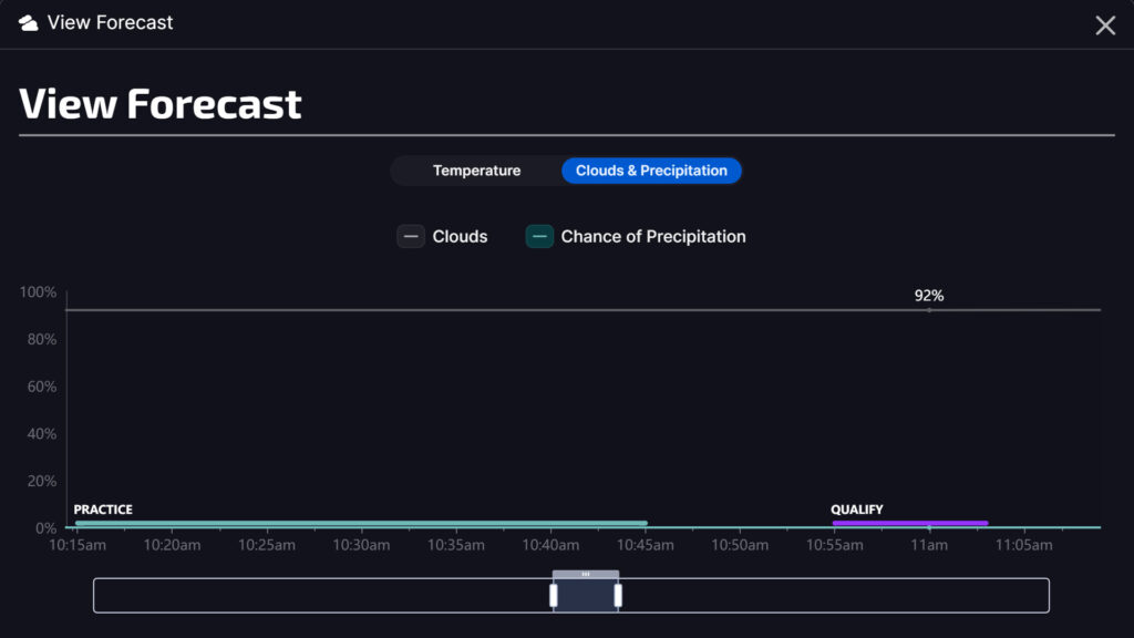 赛事天气设置为“动态”,这意味着 iRacing 广泛的天气预报系统已准备就绪并等待着您。