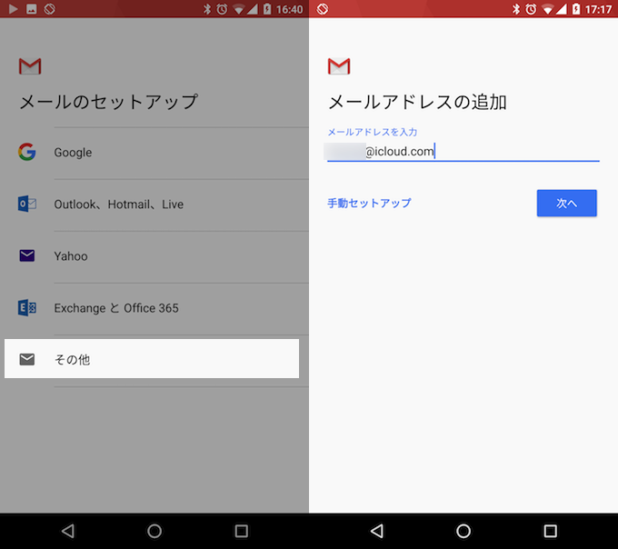 然后将出现您要设置的电子邮件地址类型,因此请转到“其他”,输入您要设置的 iCloud 电子邮件地址,然后点击“手动设置”。