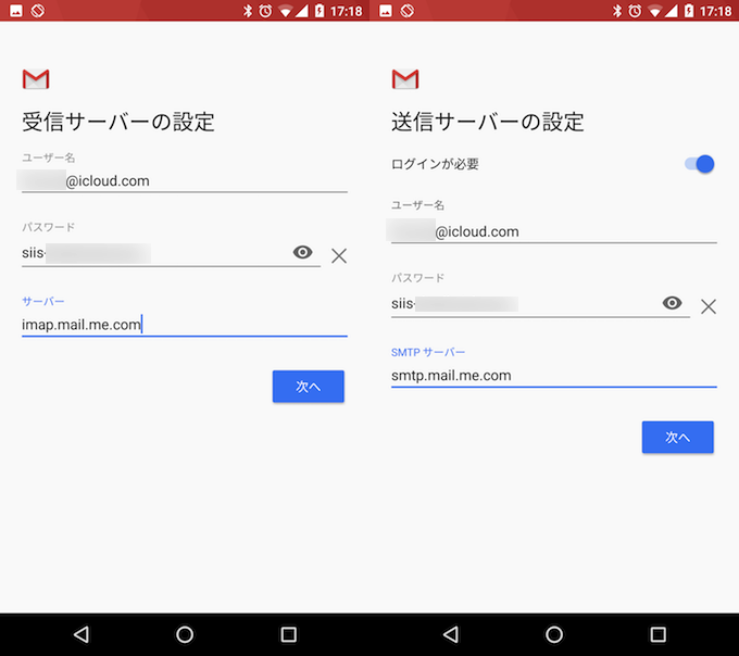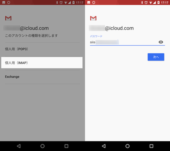 接下来,转到邮件服务器设置。由于 iCloud 不支持“POP”,因此选择“IMAP”并输入您的 iCloud 密码。