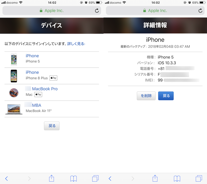 将显示使用您的 Apple ID 登录的设备列表,因此您可以通过点按要查看详细信息的设备名称来检查序列号和制造编号 (IMEI)。