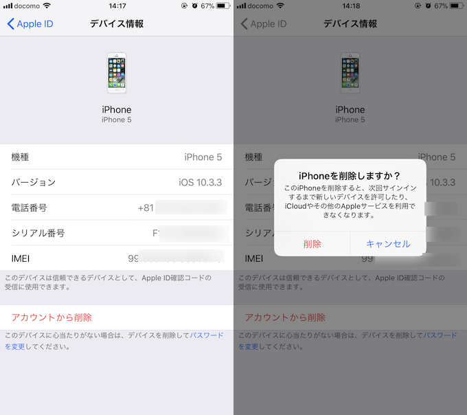 您可以通过点击要查看详细信息的设备名称来检查序列号和制造编号 (IMEI),如果您想取消设备与 Apple ID 的链接,可以通过选择“从帐户中删除”来执行此操作。