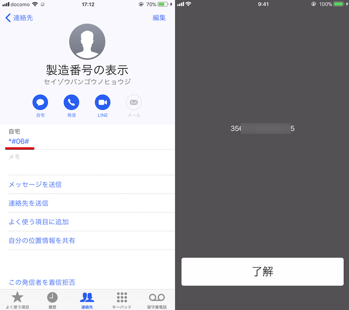另外,对于那些觉得记住字符串很麻烦的人,我们建议您将它们注册为“联系人”,这样您只需从电话簿中轻按一下即可显示序列号(IMEI)信息。