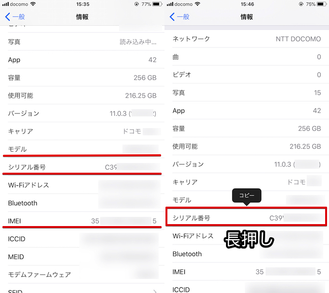 您可以从列表中查看“序列号”、“制造编号 (IMEI)”和“型号”。此外,您还可以通过按住目标信息来复制,这样可以防止您在输入长字符串时出错。