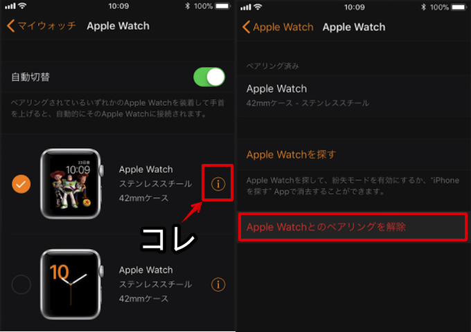 之后,点击右侧显示的“i(信息)”图标,然后选择“取消与 Apple Watch 的配对”。
