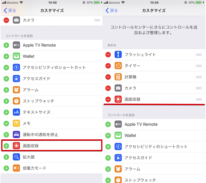 从“添加控制”项列表中选择“屏幕录制”,并确认“屏幕录制”已作为控制中心的功能添加。