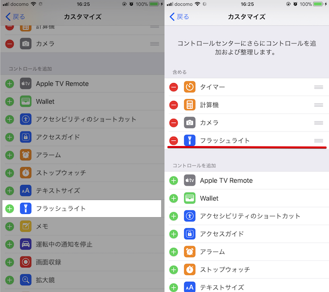 从“添加控制”项列表中选择“手电筒”,并确认“手电筒”已作为控制中心的功能添加。
