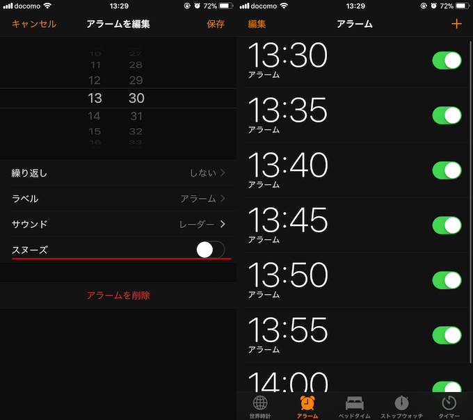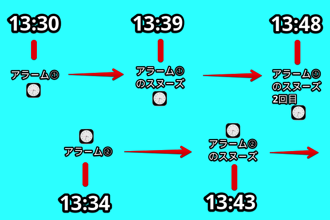 此后,闹钟①的贪睡(第一次)将在13:39响起,闹钟②的贪睡(第一次)将在13:43响起,依此类推,您可以继续每隔4-5分钟听到贪睡声。