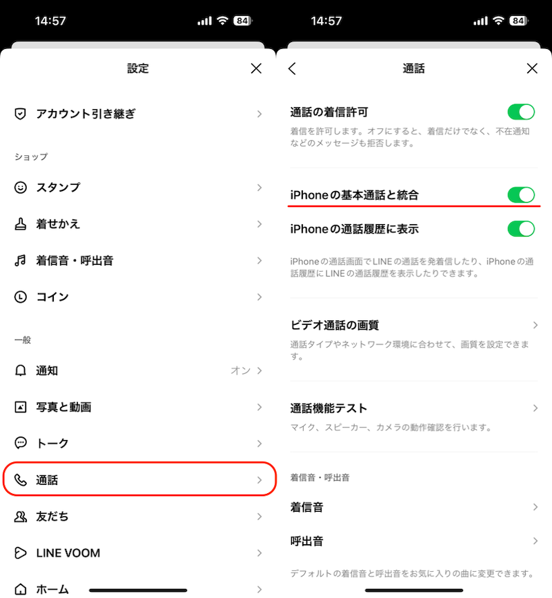 (左)LINE 应用程序设置 → 通话(右)与 iPhone 基本通话集成